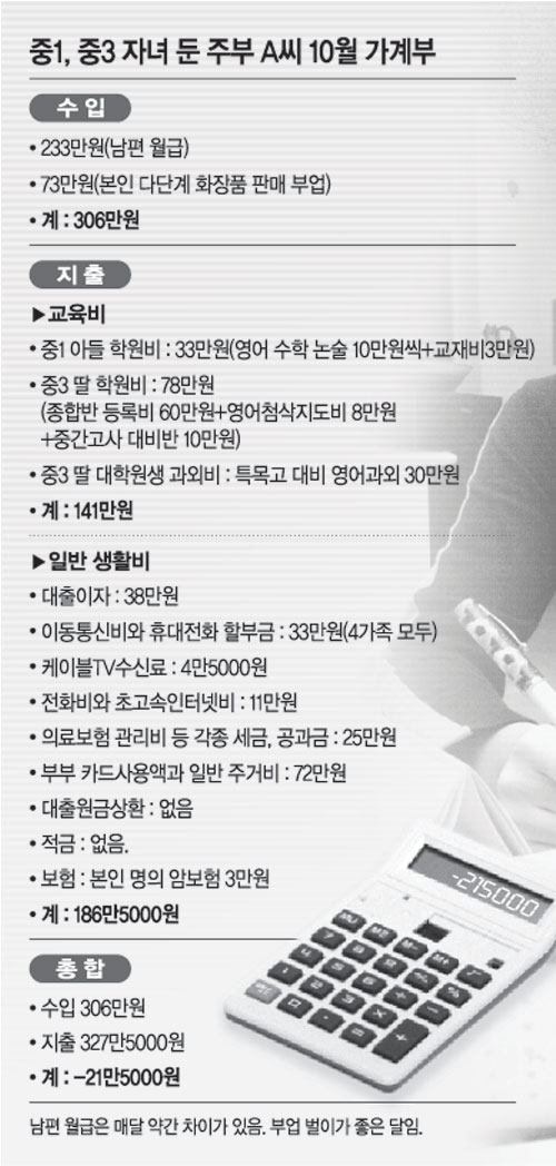 딸이 다니는 특수목적고 입시학원은 학원비가 월 60만원이 넘었다. 아들도 과목당 10만원씩 하는 영어 수학 논술 단과학원을 다녔다. 250만원 남짓한 남편 월급으로 100만원이 넘는 과외비를 대다보니 생활비도 빠듯했다.