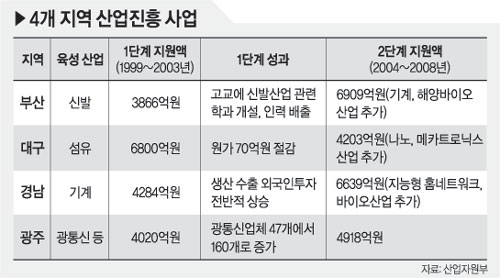 산자부도 “사업 성과가 미미했던 대구 섬유산업은 2단계 사업 예산을 융자금 450억원을 포함한 1395억원으로 줄이고 부산 신발산업도 325억원으로 대폭 축소했다”고 말해 1단계 사업의 실패를 자인했다. 산자부는 또 “기대했던 효과를 거두지 못한 이유는 지방자치단체가 지원 대상 산업을 잘못 선정했기 때문”이라며 “2단계 사업에서는 이를 반영해 지역별로 다른 산업을 추가했다”고 덧붙였다.