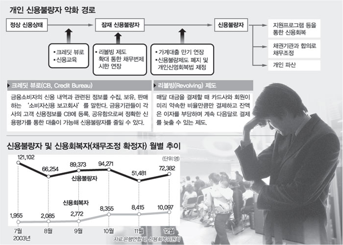 이 때문에 전문가들은 정상 신용상태인 사람이 잠재신용불량자로 전환되는 단계에서 사전에 신용 위기의 고리를 끊는 것이 신용불량 문제의 근본적 해결책이라고 보고 있다. 이헌재(李憲宰) 경제부총리가 25일 은행장들과 만나 “은행장들이 직접 나서서 잠재신용불량자의 신용 회복을 위해 노력해 달라”고 부탁한 것도 이 같은 문제의식에 따른 것으로 풀이된다.