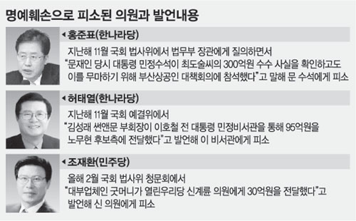문제가 되고 있는 현역 의원들의 발언은 김 의원의 경우와는 달리 ‘국회 내’에서 한 발언으로 국회의원의 면책특권 범위와 한계를 둘러싼 논란이 다시 일 전망이다. 김 의원은 민주당 상임중앙위원회의에서 “동원그룹이 노무현(盧武鉉) 후보에게 50억원을 제공했다”고 주장한 경우.
