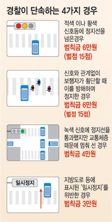 경찰은 우선적으로 △적색 또는 황색 신호등이 켜졌는데도 자동차가 정지선을 넘은 경우 △신호와 관계없이 보행자가 횡단보도를 건널 때 보행을 방해한 경우 △녹색 신호일 때 정지선을 통과했으나 무리하게 교차로에 진입해 교차로 안에 멈춰선 경우 △학교 철길 등 일시정지 표시가 있는 곳에서 멈추지 않고 그대로 통과한 경우 등 4가지 사례에 대해 집중 단속을 벌인다.
