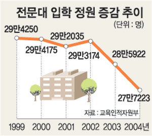 전문대 입학정원은 매년 늘어나 1999년 29만4250명에 달했으나 2000년 29만4175명, 2001년 29만2035명, 2002년 29만3174명, 2003년 28만5922명, 2004년 27만7223명 등으로 감소 추세였다.
