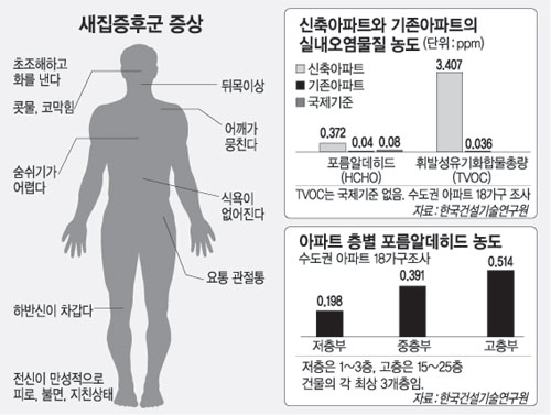 ▽새집증후군 심각하다=5월 초 국내에서 처음으로 새집증후군 클리닉센터를 개설한 한양대병원에는 상담전화가 매일 15통가량 걸려오고 있다. 지금까지 10명이 새집증후군 환자로 판명됐다. 이들은 피부가 가렵거나 기침이나 콧물이 생기고 기관지가 아픈 증상을 나타냈다.