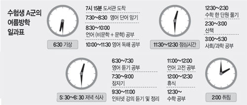 ▽강의 신청 및 시간표 짜기=방학기간은 학기 중에 비해 활용할 수 있는 시간이 많다고 착각하기 쉽다. 학교 보충수업이나 학원 강의 시간 등을 따져보면 수험생이 혼자 공부할 시간은 그리 많지 않은 경우가 많다. 특히 의욕이 앞서 많은 강의를 들으면 스스로 공부할 시간이 더욱 줄어든다.