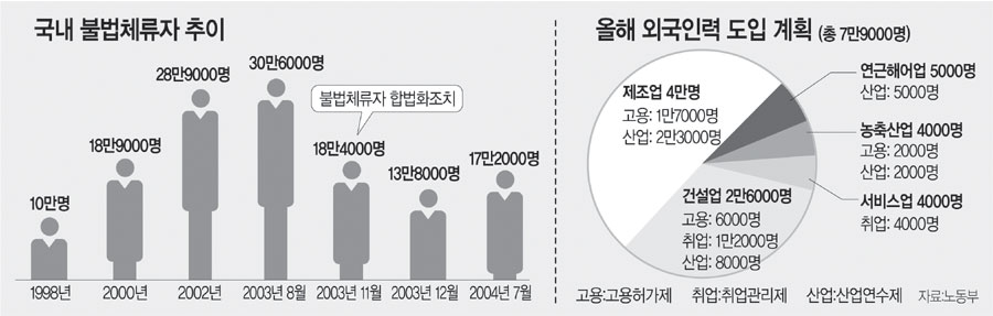 한 외국인 근로자는 “돈을 좀 모은 불법 체류자들은 단속을 피해 한국인이 거주하는 곳이나 월세가 비싼 강남 주택가로 몸을 숨기고 있다”고 전했다. 지난 주말 경기 광주시. 검문에 걸린 한 동남아계 남자가 차가 쉴 새 없이 오가는 대로 한복판으로 뛰어들었다. 쫓아가던 법무부 출입국관리소 직원들은 추격을 멈췄다. 더 쫓다간 대형 교통사고가 우려됐기 때문. 한 출입국관리소 직원은 “올해 초까지만 해도 검문에 걸리면 순순히 응하는 분위기였으나 요즘은 ‘고용허가제 하에선 한번 출국하면 다시는 못 온다’는 생각 때문인지 필사적”이라고 말했다.