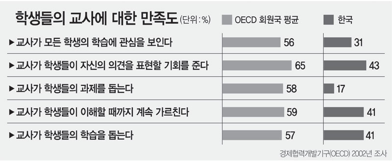 그러나 국내의 교사들에 대한 신뢰도와 만족도는 그리 높지 않다. 경제협력개발기구(OECD)가 2002년 30개 회원국, 18개 비회원국의 15세 이상 학생 각 5000여명을 상대로 조사한 결과 ‘교사가 모든 학생의 공부에 관심을 보인다’는 문항에 국내 학생들은 31%만 ‘그렇다’고 답해 회원국 평균 56%에 크게 못 미쳤다.