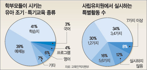 교육인적자원부가 2002년과 올해 두 차례 실시한 ‘유아의 일상생활과 어머니의 양육태도’에 관한 조사에 따르면 특별과목을 지정해 교육하는 사립유치원은 전체의 90%. 정규과목 대신 특강을 넣는 경우도 65%였다.