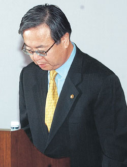 ![]() 안병영 부총리 겸 교육인적자원부 장관이 22일 국회 교육위원회에 출석해 휴대전화 수능 부정사건으로 국민에게 심려를 끼친 데 대해 사과하며 고개를 숙이고 있다. 김경제기자 |