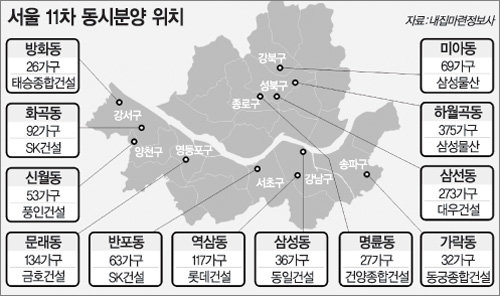 올해 마지막으로 이뤄지는 서울 11차 동시분양에서는 12개 사업장에서 2805가구가 공급되고 이 중 조합원분을 제외한 1297가구가 일반 분양된다. 당초 서울시에 분양신청을 냈던 동구종합주택건설(총 74가구 중 34가구 일반분양)은 분양을 연기했다.