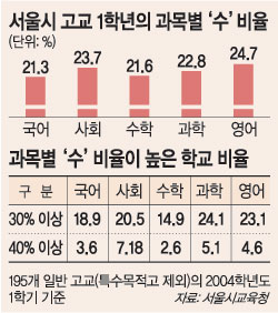 ‘수’를 받은 학생 비율이 30%가 넘는 과목이 3개 이상인 학교도 25개교로 전체의 12.5%나 됐다. 이들 고교는 강남(강남 서초구) 지역에 소재한 경우가 7개교로 가장 많았고 이어 북부(도봉 노원구) 6개교, 동부(동대문 중랑구)와 강서(강서 양천구) 지역에 각각 3개교 순이었다.