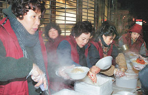 뼛속까지 파고드는 영하 12도의 추위를 뚫고 빨간 조끼를 입은 한 무리의 아줌마들이 나타났다. 매주 화요일 밤 이곳 노숙자들에게 음식을 나눠 주는 서울 강서아파트연합부녀자원봉사회 ‘일어서기’ 소속 주부들.