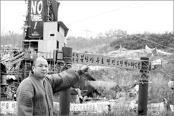“원래 조계종 내부에 무슨 일이 있으면 내가 해결사라고 할까, 행동대장이라고 할까 그런 역할을 많이 했어요. 2001년 말에서 2002년 초 큰스님 몇 분이 저를 보자고 하더니 사패산 터널공사를 반대해야겠으니 그걸 좀 맡아달라는 겁니다. 당시는 사패산이 뭔지도 몰랐고 농성할 생각도 없었어요. 그래서 현장에 비구니 스님 한두 분을 보내 몸으로 막아보라고 코치만 했는데 얼마 뒤 그 비구니 스님들이 건설회사 용역들에 의해 끌려나온 겁니다. 조계종 차원에서 항의대회가 열렸는데 몇 분이 ‘기왕 당신이 코치했으니 책임져야 할 거 아니냐’고 해 어쩔 수 없이 현장에 가서 농성을 시작한 거죠.”