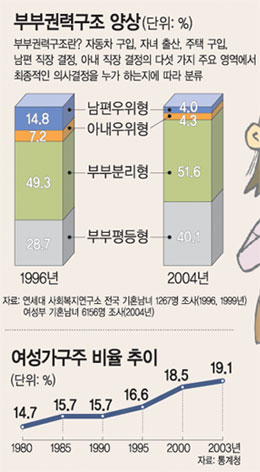 집안일과 관련된 중요한 의사결정을 아내가 원해서라기보다는 남편들이 체면 때문에, 혹은 귀찮아서 아내에게 위임하는 경우가 많은 것도 사실. 그럼에도 불구하고 집안일뿐 아니라 주거문제나 남편 직장과 관련된 일도 서로 의논하거나 함께 결정하는 부부가 늘고 있다.