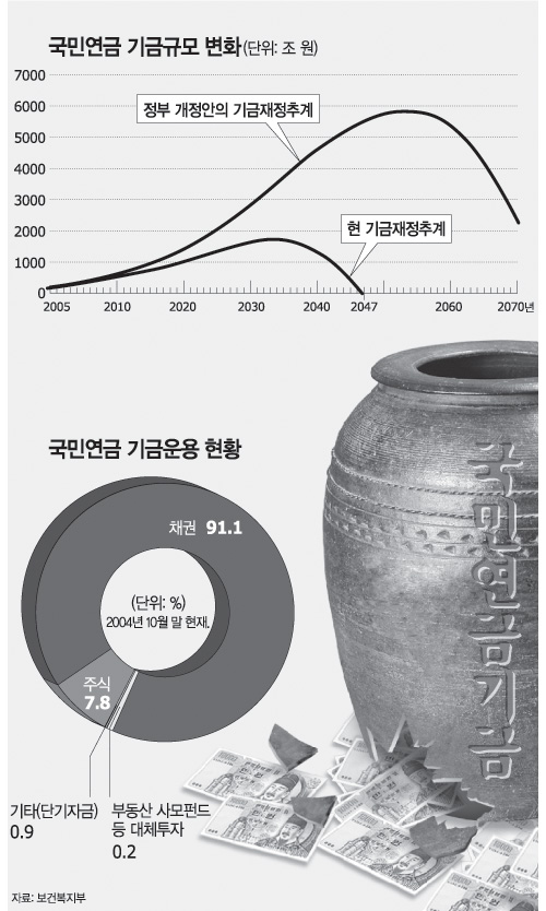 하지만 이는 합계출산율(여성 1명이 평생 낳는 자녀의 수)을 1.4명으로 잡고 계산한 것이어서 출산율의 급격한 저하를 반영하면 2070년까지 연장은 무리다. 게다가 보험료는 놔두고 노후 연금만 50%로 줄이자는 열린우리당의 방안은 고갈 시점을 5년 연장하는 효과밖에 없다. 미봉책이라는 비판이 나오는 이유가 그래서다.