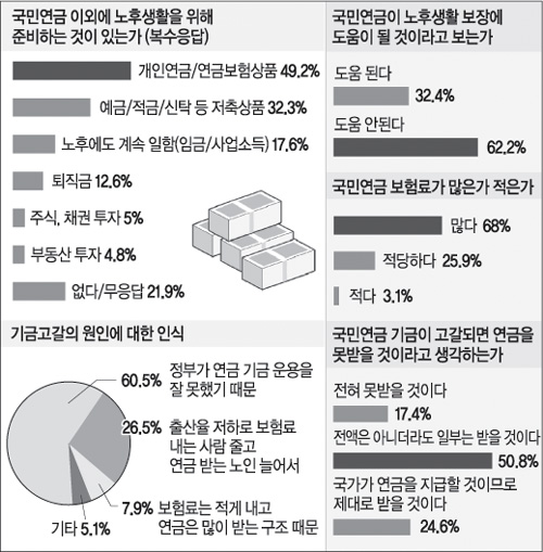 정부, 여야, 학계의 일치된 견해는 기금고갈 위기의 근본 원인이 ‘적게 내고 많이 받는’ 현재 연금구조에서 비롯됐다는 것. 그러나 조사에서 이를 문제로 지적한 사람은 7.9%에 불과했다. 이 인식 차이의 해소가 연금문제 해결의 첫걸음이라는 지적이다.