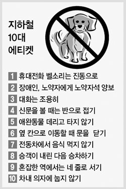 공사가 밝힌 10대 에티켓 중에는 △휴대전화 벨소리는 진동으로, 통화 시에는 작은 목소리로 △신문을 볼 때는 반으로 접기, 다리 꼬고 앉지 않기 △옆 칸으로 이동할 때는 문을 닫고 가기 △전동차에 음료수 컵을 들고 타거나 음식 먹지 않기 등이 포함돼 있다.