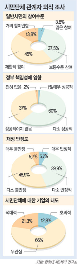 재정 부문 점수는 가장 낮은 0.8점이었으며 조직 및 기술(1.0점)과 인적자원(1.3점) 부문도 취약한 것으로 나왔다. 시민의 참여를 통한 상향식 운동이 아니라 명망가 중심의 하향식 운동이 낳은 필연적 결과라는 지적이다. 그러다 보니 시민단체를 이끄는 지도부의 대표성에 대해서도 시민단체 관계자들 스스로가 ‘문제 있다’(45%)고 대답할 정도다.