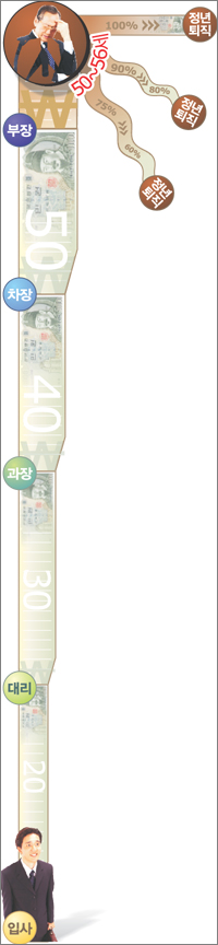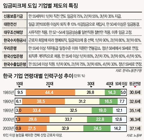 한국노동연구원 김정한(金廷翰) 연구위원은 “금융권이나 공사에서 이 제도를 많이 도입한 이유는 임금이 다른 직장에 비해 높아 인건비를 줄여야 할 필요가 있는 데다 직원들은 외환위기 이후 명예퇴직 등으로 정년을 제대로 보장받지 못하고 있었기 때문”이라고 말했다.
