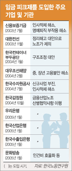 2003년 제조업체 가운데 처음으로 이 제도를 받아들인 대한전선은 회사의 위기를 느낀 노조가 먼저 회사 측에 도입을 제안했다. 지금은 전국경제인연합회 등 경제단체들이 인건비 부담을 줄이기 위한 방안으로 이 제도 도입을 기업들에 권고하고 있다.