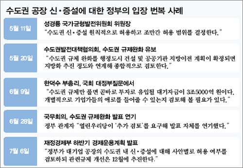 재경부 산업자원부 건설교통부 등은 △현재 대기 중인 대기업 공장 신·증설부터 허용하는 방안 △법령을 고쳐 수도권 공장 신·증설 규제를 일괄적으로 풀어 주는 방안을 놓고 협의를 벌여 첫 번째 안에 대략적인 의견 접근을 봤다.