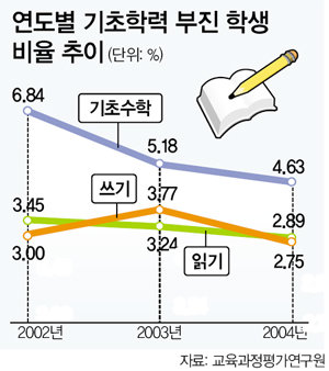 읽기 영역의 부진학생 비율은 2002년 3.45%에서 2003년 3.24%, 지난해 2.89%로 떨어졌다. 쓰기는 2002년 3.00%에서 2003년 3.77%로 늘었다가 지난해 2.75%로 줄었다. 기초수학 부진 학생도 각각 6.84%, 5.18%, 4.63%로 해마다 감소 추세다.