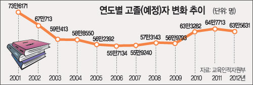 10일 교육인적자원부가 학년별 재학생을 토대로 작성한 ‘고졸자 및 고졸 예정자 변화 추이’ 자료에 따르면 고교 졸업자 수는 2001년 73만6171명에서 2005년 56만2392명으로 계속 감소한다.
