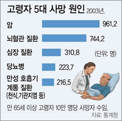 통계청이 20일 발표한 ‘고령자 사망원인 분석결과’에 따르면 2003년 기준으로 고령인구 10만 명당 암으로 인한 사망자는 961.2명으로 암이 최대 사망원인이었다. 그 다음은 뇌혈관 질환(744.2명) 심장 질환(310.8명) 당뇨병(223.7명) 순.