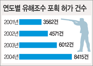 ▽개체 수가 늘어난 탓=환경부는 야생동물 가운데 멧돼지, 고라니, 참새, 까치, 꿩, 멧비둘기, 청서 등 14종을 유해 조수로 지정하고 있다.