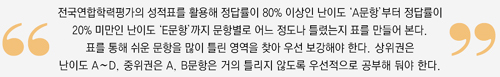 우선 성적표를 활용해 정답률이 80% 이상인 난이도 ‘A문항’부터 정답률이 20% 미만인 난이도 ‘E문항’까지 문항별로 어느 정도나 틀렸는지 표를 만들어본다. 표를 통해 쉬운 문항을 많이 틀린 영역을 찾아 우선 보강해야 한다. 예컨대 언어의 경우 A문항을 비문학 읽기에서 주로 틀렸다면 이 분야가 취약한 것. 상위권은 난이도 A∼D, 중위권은 A∼C 문항은 거의 틀리지 않도록 우선적으로 공부해 둬야 한다.