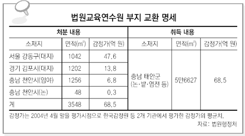 이 땅은 감정평가액 기준으로 68억 원가량. 법원행정처는 이 땅을 경기 김포시 옛 김포등기소 터 등 수도권과 충청권 일대에 대법원이 보유하던 유휴 토지 3548m²(1075평)와 교환형식으로 취득했다고 감사원은 밝혔다.