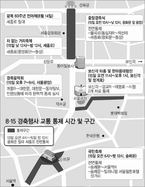광복절인 15일 경복궁부터 숭례문에 이르는 도로에서 비슷한 시간대에 3개의 행사가 열린다. 문화관광부가 낮 12시∼오후 6시 경복궁 앞에서 ‘차 없는 거리축제’를, 행정자치부가 오후 7시 10분∼9시 숭례문 광장에서 ‘새로운 시작, 평화의 노래’라는 대중음악회를 연다. 서울시는 시청 앞 서울광장에서 오후 7시 30분∼9시 서울시립교향악단 연주회를 개최한다.