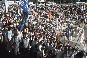 ![]() 14일 오후 연세대에서 열릴 예정이던 8·15 민족대축전 행사가 연세대 학교당국과 비운동권인 총학생회의 강한 반대로 이날 오후 11시 경희대로 장소를 옮겨 개최됐다. 경희대도 행사개최에 반대의 뜻을 나타냈지만 참가자들의 출입을 통제하지는 않았다. 이날 열린 ‘자주·평화·통일을 위한 결의의 밤’ 행사에는 한국대학총학생회연합 소속 대학생 등 1만여 명이 참가했다. 신원건 기자 |