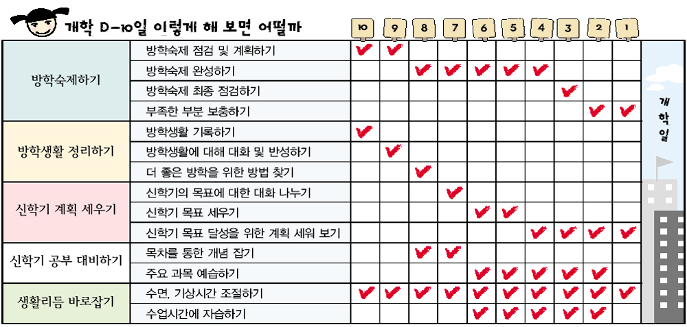 ▽방학 마무리=수업시간의 중요성과 수업시간에 집중하는 방법에 대해서 어머니가 학생과 함께 이야기를 나누어 보고 준비하는 것이 필요하다. 수업시간에 배운 내용을 노트에 정리해 보는 것도 수업에 대한 집중도를 높여 줄 수 있다.