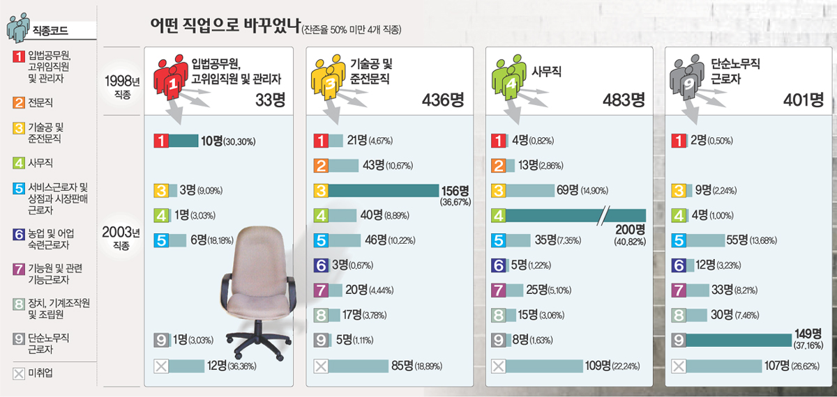 전체적으로 보면 직종의 하향 이동이 상향 이동보다 눈에 띄게 많았다. 예를 들어 고위 임직원이나 관리자 가운데 미취업자가 된 비율은 36.4%였다. 전문직이나 사무직에서 밀려난 상당수는 서비스업이나 판매업을 선택했다. 1998∼2003년 직종을 바꾼 사람 중 서비스업이나 판매업으로 전환한 비율은 1099명 중 209명(19%)에 달했다.