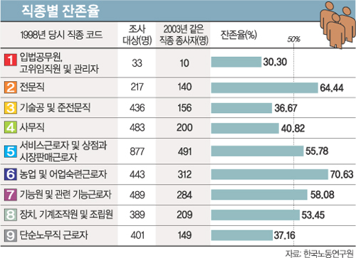 전체적으로 외환위기 이후 5년 간 취업자의 절반가량(51.8%)이 원래 직종을 유지한 가운데 ‘입법공무원, 고위 임직원 및 관리자’ 그룹과 ‘단순노무직 근로자’ 그룹의 직종 유지율이 각각 30.3%, 37.2%로 가장 낮게 조사됐다.