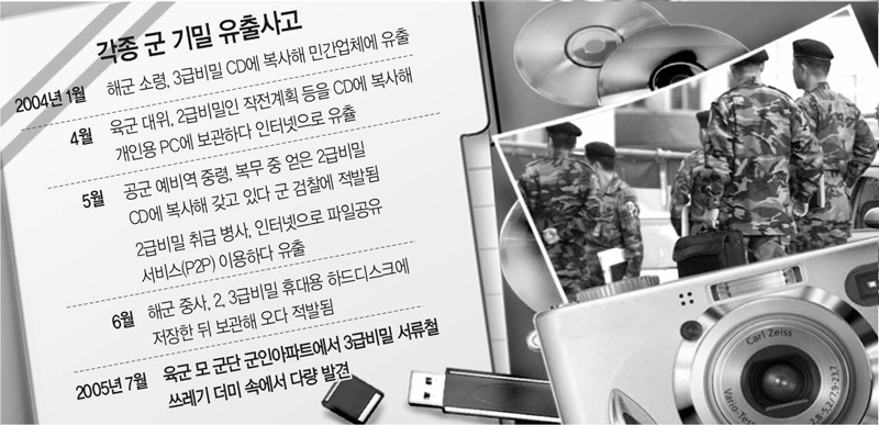 ▽‘기는 대책’=문서로 존재하던 군사비밀이 컴퓨터 파일로 생산 보관 유통되면서 유출 위험은 심각한 수준이라는 게 군 내의 공통된 인식이다. 특히 컴퓨터를 사용하다 실수로 군 기밀을 유출한 과거 사례 등과 달리 음어표 유출사건은 카메라폰 등으로 찍어 인터넷을 통해 고의로 유포했다는 점에서 더욱 심각하다.