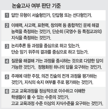 ▽논술 기준은=교육부는 ‘논술은 제시된 주제에 관해 필자의 의견이나 생각을 논리적으로 서술하도록 하는 시험’으로 정의했다.