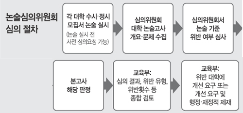 교육부는 대강의 기준만 만들어 대학이 논술 출제의 원칙으로 삼게 하고, 개별 대학의 논술이 이 기준을 충족했는지의 판단은 논술심의위원회에 넘겨 논란의 중심에서 비켜선다는 방침이다.