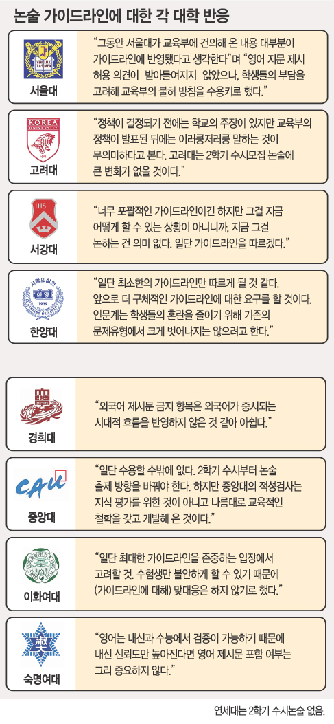 ▽일부 대학 “아쉽다”=논술고사를 치러 온 일부 대학은 “가이드라인 내용이 당황스럽고 납득하기 어려운 점도 있다”며 불만과 아쉬움을 보이기도 했다.
