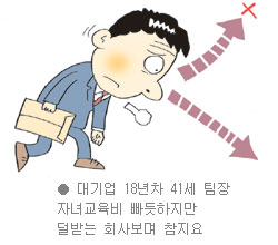 300만 원 남짓한 월급에서 세 아이(14세, 9세, 7세)의 교육비로 들어가는 돈이 약 80만∼90만 원. 학원도 보내야 하고 학습지도 사줘야 한다. 월급에서 교육비와 생활비를 빼면 아주 빡빡하다. 한 달에 15만 원씩 붓는 적립식 펀드가 저축의 전부.