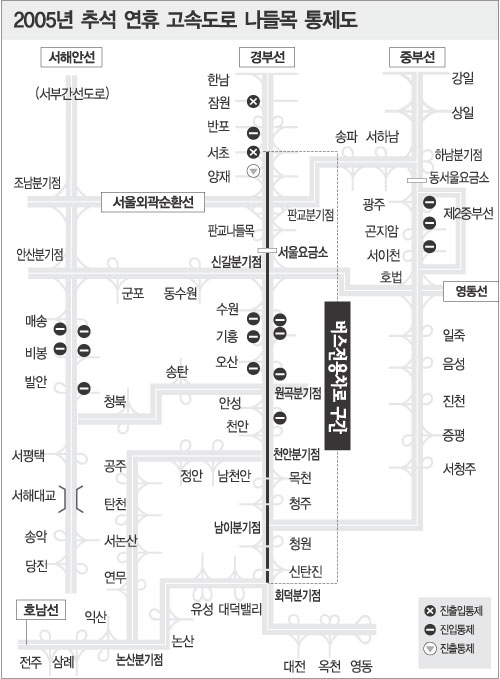 건설교통부는 공사 중인 국도를 임시 개통하고 버스전용차로제를 경부고속도로 서초∼신탄진 나들목에서 시행(16일 낮 12시∼19일 밤 12시)하는 등의 대책을 7일 발표했다.