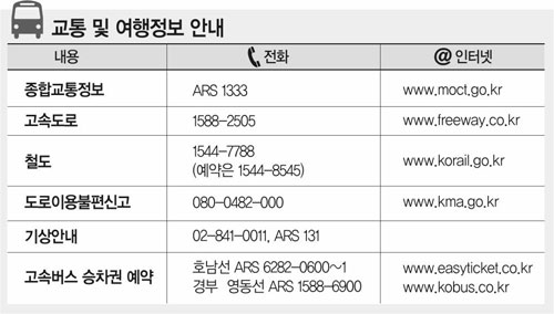 건교부는 귀성길에 승용차를 이용하면 서울∼대전 4시간 40분, 서울∼부산 9시간 10분, 서울∼광주 8시간 50분이 걸릴 것으로 내다봤다.