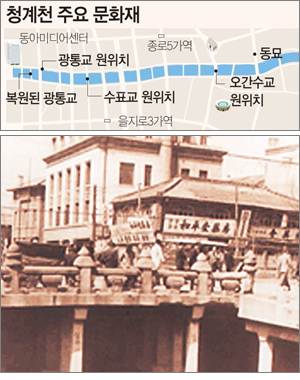 《20일 낮 12시 반경 서울 중구 청계1가. 최근 복원된 청계천 광통교(廣通橋·광교)를 구경하기 위해 인근 직장인들이 삼삼오오 모여들었다. 더러는 난간을 쓰다듬고 더러는 밑으로 내려가 석축을 둘러보았다. 원래 위치가 아니라 상류로 200m 올라온 곳에 복원되어 아쉽긴 하지만 1958년 청계천 복개공사 때 도로 아래에 묻혔던 광통교가 47년 만에 다시 모습을 드러낸 것이다. 광통교를 비롯해 청계천 주변엔 소중한 문화재가 적지 않다. 조선시대 이래 청계천과 함께 흘러온 역사와 문화, 서울 사람들의 애환의 흔적이다.》
