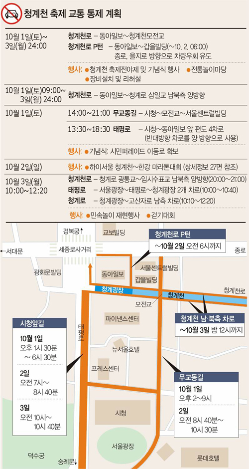 청계천 개장 기념식 및 개막 행사가 열리는 1일 오전 9시부터 3일 밤 12시까지 서울 종로구 세종로 동아미디어센터(동아일보사) 앞에서 종로구 관수동 삼일교까지 청계천 양방향 도로의 차량 진입이 통제된다.