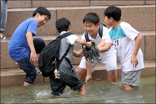 | ▲ 초등학생들이 1일 오전 청계천 나래교 등에서 물놀이를 하고 있다./구민회 동아닷컴 기자 |