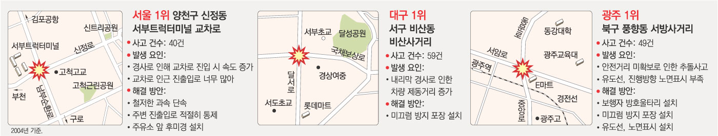 본보가 단독 입수한 도로교통안전관리공단의 2004년 전국 도로별 교통사고 통계에 따르면 교통사고가 잦은 곳에서 발생한 사고는 운전자의 부주의뿐만 아니라 교차로 등 교통체계의 근본적인 부실 탓도 큰 것으로 나타났다.