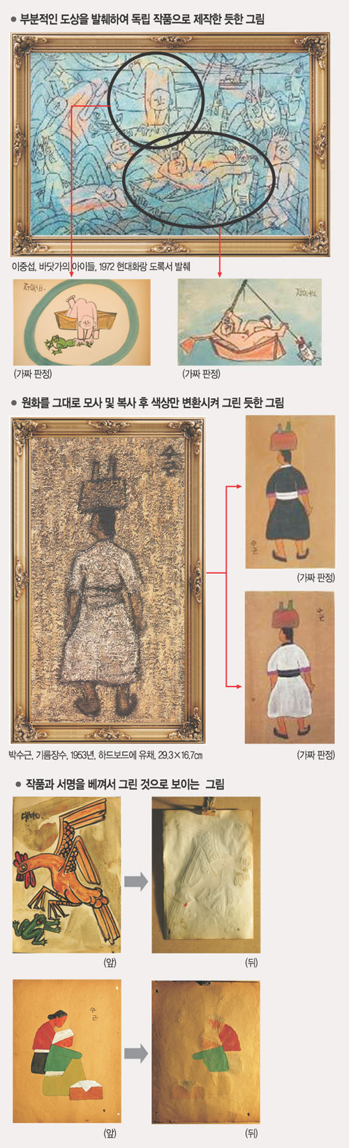 ▽위작 유형=검찰이 그림들을 사진 촬영해 유형별로 분석한 결과 절반가량은 원화를 그대로 베끼고 절반가량은 원화의 일부 이미지만을 확대 발췌해 독립적인 그림으로 만든 것으로 나타났다. 미술계 관계자는 “보통 원화를 베끼는 게 일반적인 위조방식인데 원화 일부만 모사해 그리는 것은 전례가 없는 새로운 방식”이라고 말했다.