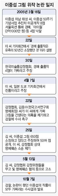 ▽이중섭 유족 반응=이중섭의 차남 태성 씨는 검찰 발표 후 본보에 e메일을 보내 “유족은 이번 검찰 발표를 인정하지 않는다”며 “검찰은 위작이라고 판단한 모든 과학감정의 절차와 과정, 감정위원들의 명단 및 판단 근거를 공개하라”고 요구했다. 이 씨는 “유족은 아버지의 명예가 더럽혀진 것에 대해 깊이 상처를 받고 있다”며 “1년이 걸릴지, 10년이 걸릴지 모르겠지만 할 수 있는 모든 노력을 다해 이 억울함을 꼭 밝히겠다”고 말했다.