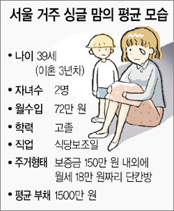 통계청 자료에 따르면 2000년 엄마와 미혼 자녀로만 이뤄진 가구는 총 92만3000가구. 2010년에는 싱글 맘 가구가 140만 가구에 육박할 것이라고 전문가들은 보고 있다. 숙명여대 서영숙(徐永淑·가정아동복지학) 교수는 “이혼율이 계속 높아지고 있어 싱글 맘 가족을 이대로 방치할 경우 심각한 사회문제로 대두될 수 있다”며 “정부 지원과 사회적 관심이 절실하다”고 지적했다.