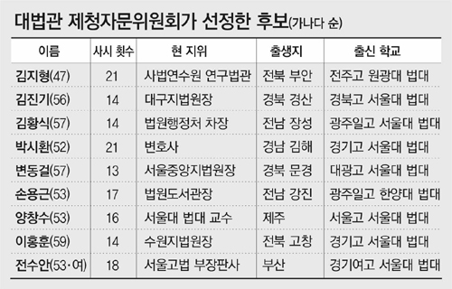 ▽‘다양한’ 인물 추천=9명의 후보는 법원 내부와 재야 법조계, 여성, 학계, 비서울대 출신 등에서 고르게 추천됐다.